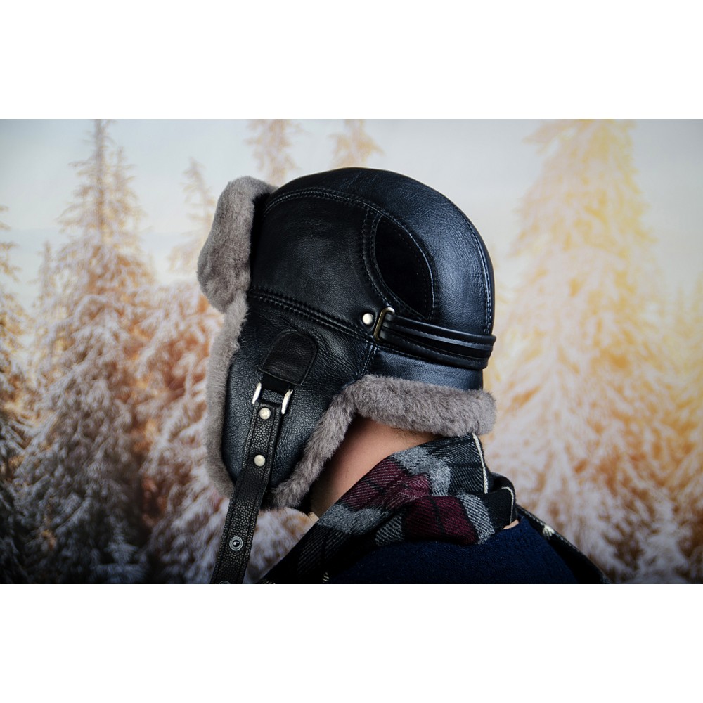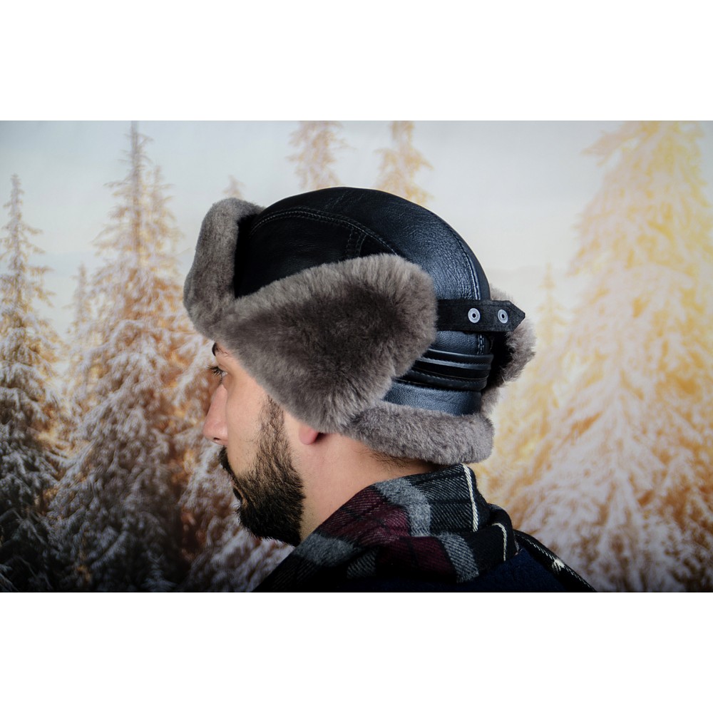 Мъжка Зимна Шапка Естествена Кожа Черна Телешки Бокс
